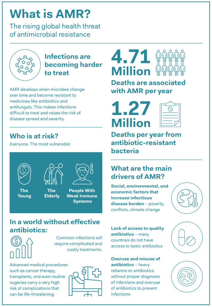Antimicrobial or antibiotic resistance is the term used to describe the immunity of bacteria to antibiotics – crucial medicines that treat infections either by killing off bacteria or inhibiting their growth. Now widespread, antibiotic resistance arose as a result of excessive use of antibiotics in humans, animals, and plants and has become a global public health issue. According to current WHO estimates, around 4.71 million deaths worldwide were associated with bacterial antimicrobial resistance as of 2021.