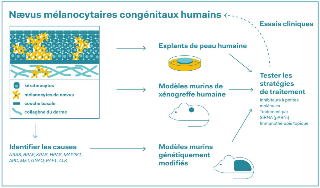 Le nævus mélanocytaire congénital (NMC) est une maladie de peau rare, d’origine génétique, dans laquelle de larges grains de beauté (nævus) qui démangent, voire sont douloureux, peuvent couvrir jusqu’à 80 % de la surface de la peau (nævus géant) et évoluer en cancer de la peau, le mélanome. Contrairement à la plupart des grains de beauté qui apparaissent au cours de la vie, ceux-ci sont présents dès la naissance. Les possibilités de traitement étaient jusqu’à présent limitées : par des opérations complexes ou des traitements au laser, on peut enlever en partie les nævus, mais le risque de cancer reste quasiment inchangé. Des médicaments permettent en général uniquement de soulager les symptômes tels que démangeaisons, douleurs ou crampes.